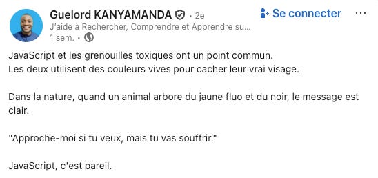 Je vous laisse avec le post de Guelord sur JavaScript et l’analogie avec les grenouilles toxiques.